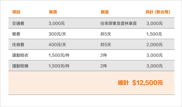 本案資助項目包含110年全國中等學校運動會拳擊錦標賽賽事期間(2021/4/17-2021/4/22,共5天)選手支出費用,詳細項目茲列如下: