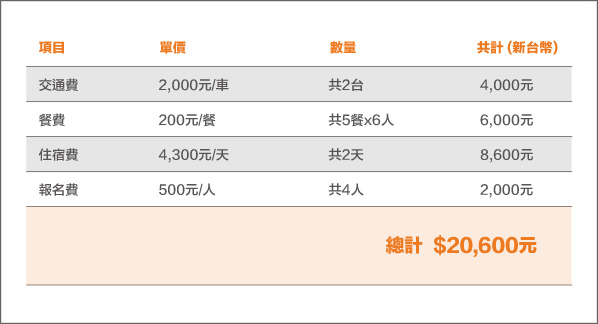 本案資助項目包含第五屆全國原住民拳擊錦標賽賽事期間(2019/12/20-2021/12/22,共3天)所有支出費用,詳細項目茲列如下: