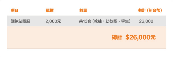 本案資助項目包含AUBA拳擊部落訓練站運動團服設計及印製所有支出費用,詳細項目茲列如下:
