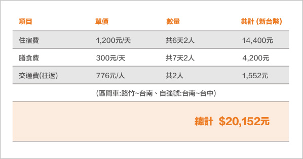 本案資助項目包含110年11月19~110年11月25日,共7天 (11/19出發技術及抽籤會議)所有智琳與教練支出費用,詳細項目茲列如下: