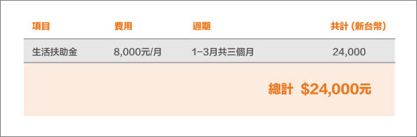 本案資助項目包含2022年第一季的生活費補助,詳細項目茲列如下: