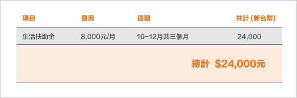 本案資助項目包含2022年第四季的生活費補助,詳細項目茲列如下: