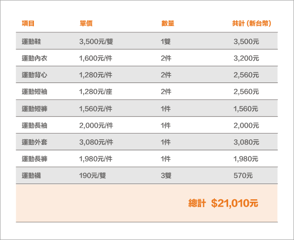 本案資助項目包含112年度的運動裝備購買費用,詳細項目茲列如下: