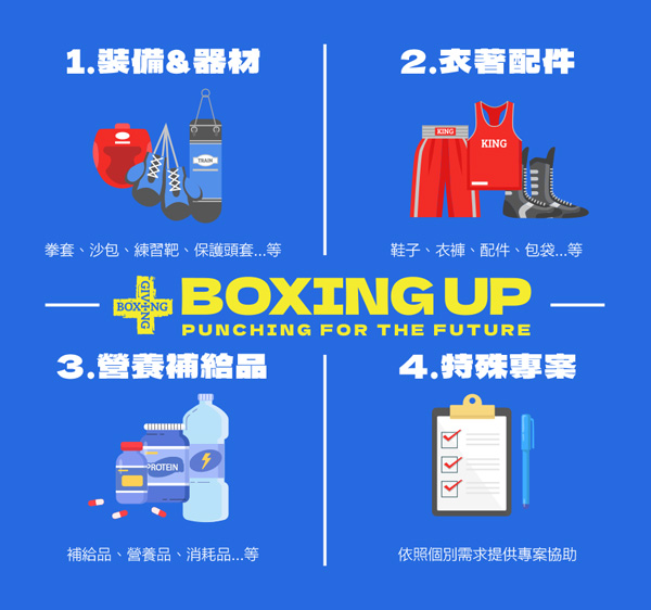 「Boxing up:拳星未來」計劃主要為提供物資上的補助 (例: 訓練或比賽用器材、裝備、衣著、消耗品、補給品...等),透過裝備的提昇,幫助選手們精進自己的技能和賽事表現。
