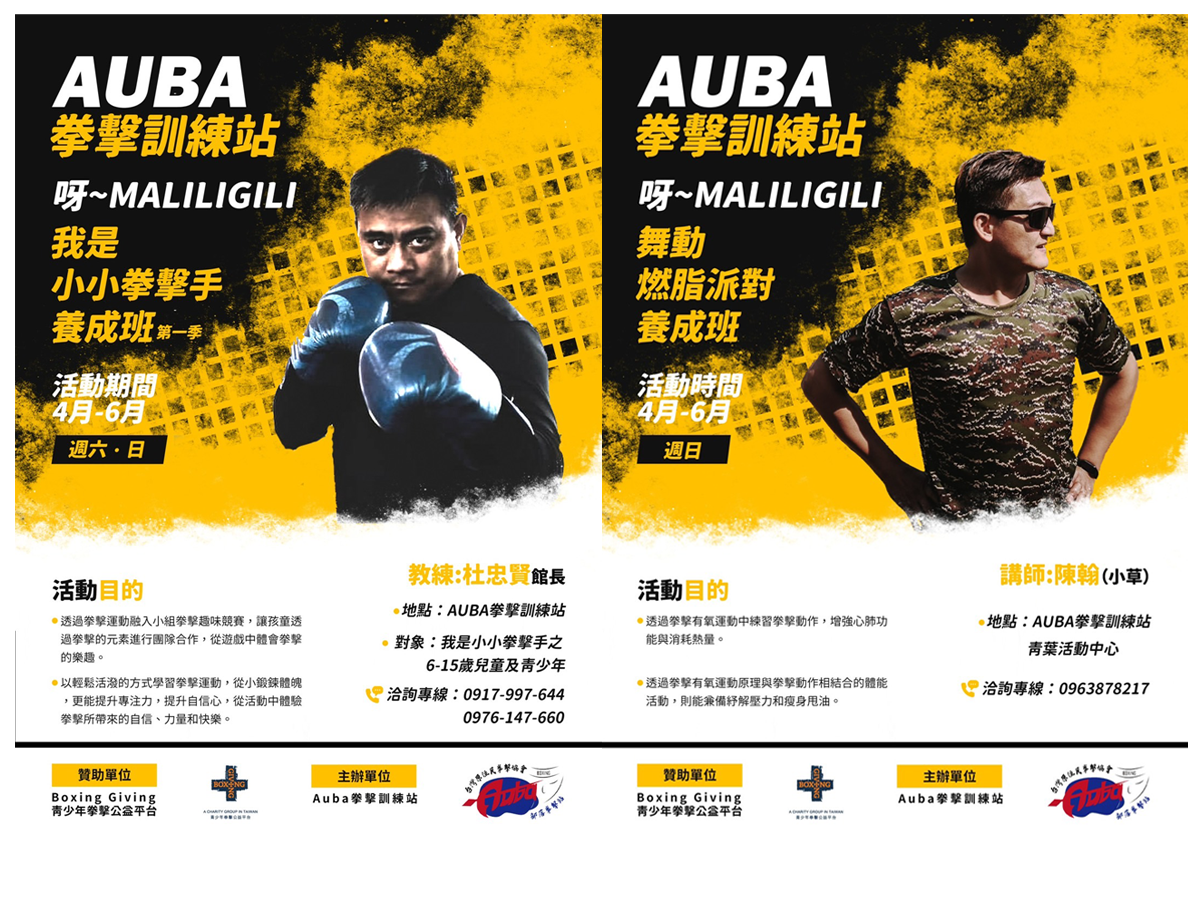青少年拳擊公益平台 BoxingGiving 攜手 Auba 拳擊訓練站,共同合作舉辦名為「呀~Maliligili 我是小小拳擊手&燃脂舞動派對」的活動課程,旨在為有興趣的參與者帶來一場融合拳擊與有氧運動的健康體驗。舉辦這些活動可有效推廣基層拳擊運動,讓更多的弱勢孩童體驗拳擊的樂趣並激發他們投入的熱情,也同時量身打造專屬於成年人的健康燃脂健身活動,提升健康水平和心理素質。